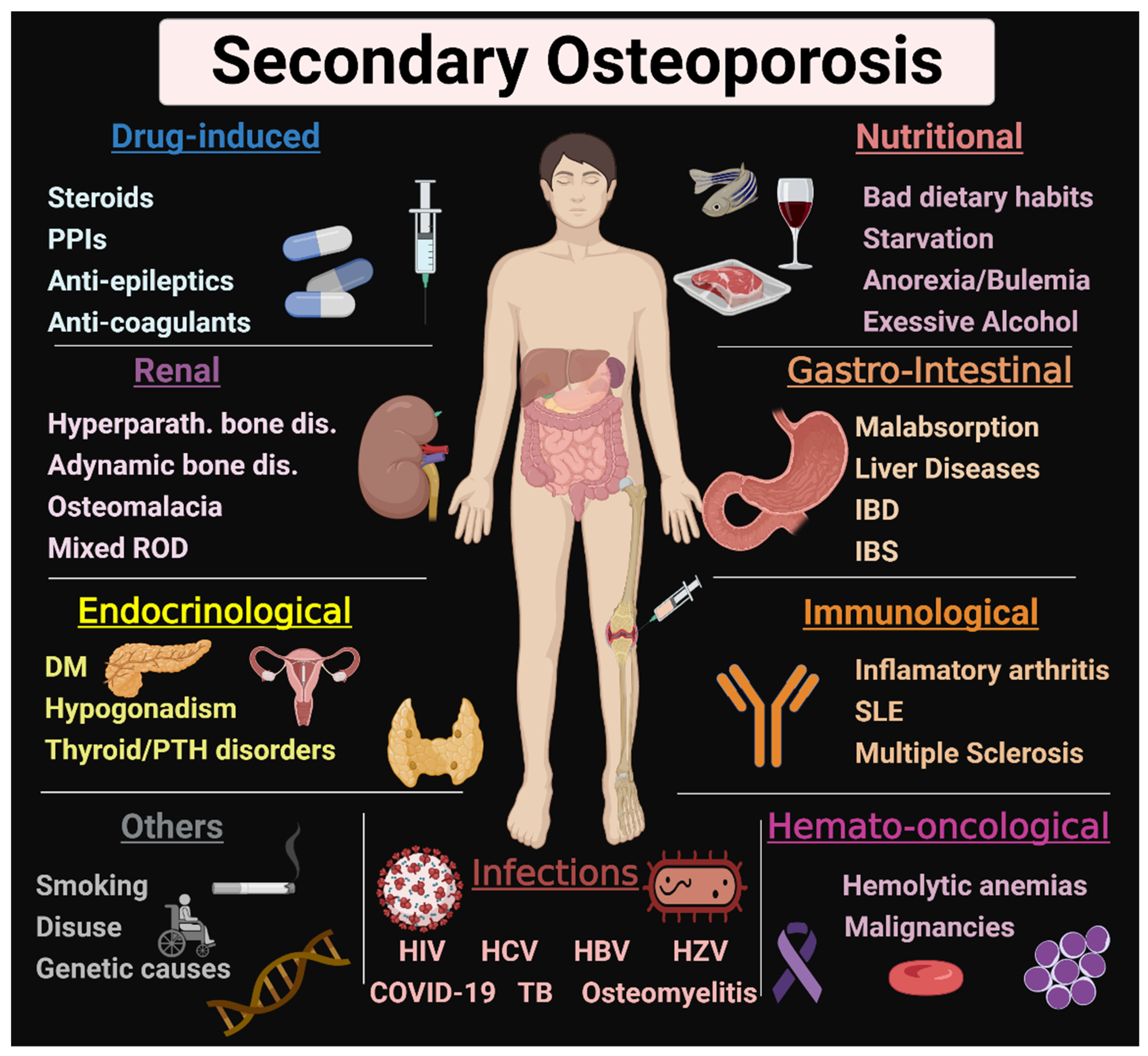 Secondary Osteoporosis is the demineralisation and subsequent weakening of the bones causes by medical conditions, procedures and medications. These are characterised by causing bone loss, increasing fracture risk, directly affecting bone remodelling, indirectly affecting bone remodelling or interfering with the attainment of peak bone mass in younger individuals.